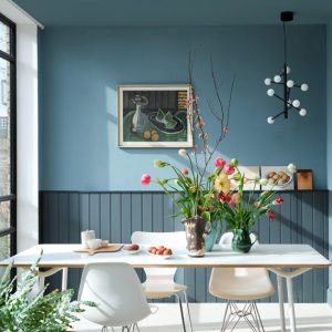 Stone Blue is a cheerful and lively mid-toned blue, just as at home on a feature wall or piece of furniture as it is when used from floor to ceiling. Try it with deep purple colour Pelt for an unexpected combination with a vintage feel, or with the pale neutral tones of Dimpse for a more traditional look.